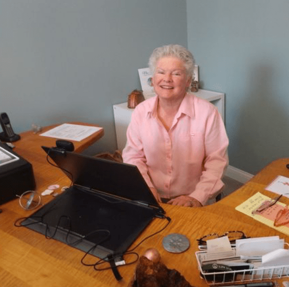 When I started, I was using a desktop computer in my own office. I sat on my tractor seat chair with my curly maple desk, using my lowered ergonomic keyboard pad. My reading glasses, pen and paper at my side. Favorite objects on my desk—several rocks, a bronze mouse, a triangular piece of spaulted maple, a disk with the impression of my beloved kitty’s paw. My printer, of course.